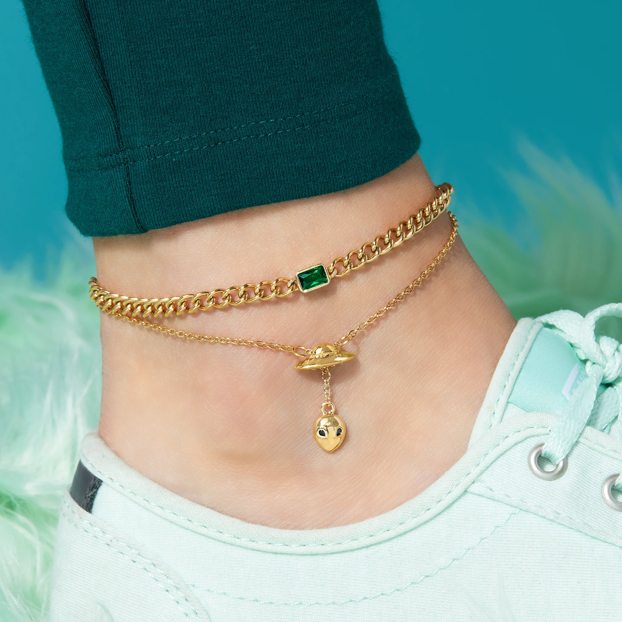 Wear your love for the unexplained in this unique, dangly anklet chain featuring a UFO and alien head.