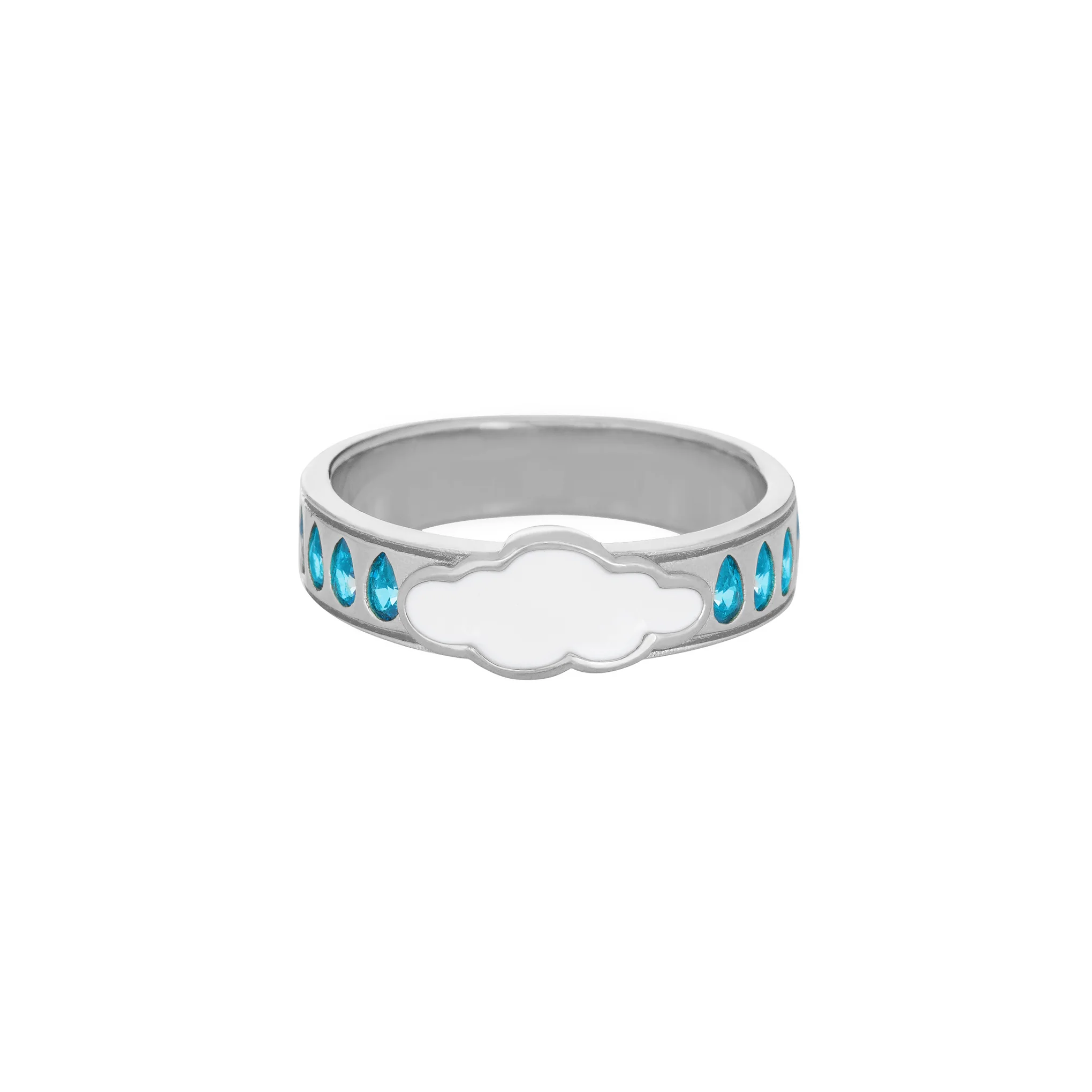 This unique ring band features a white enamel cloud surrounded by aquamarine stone rain drops.