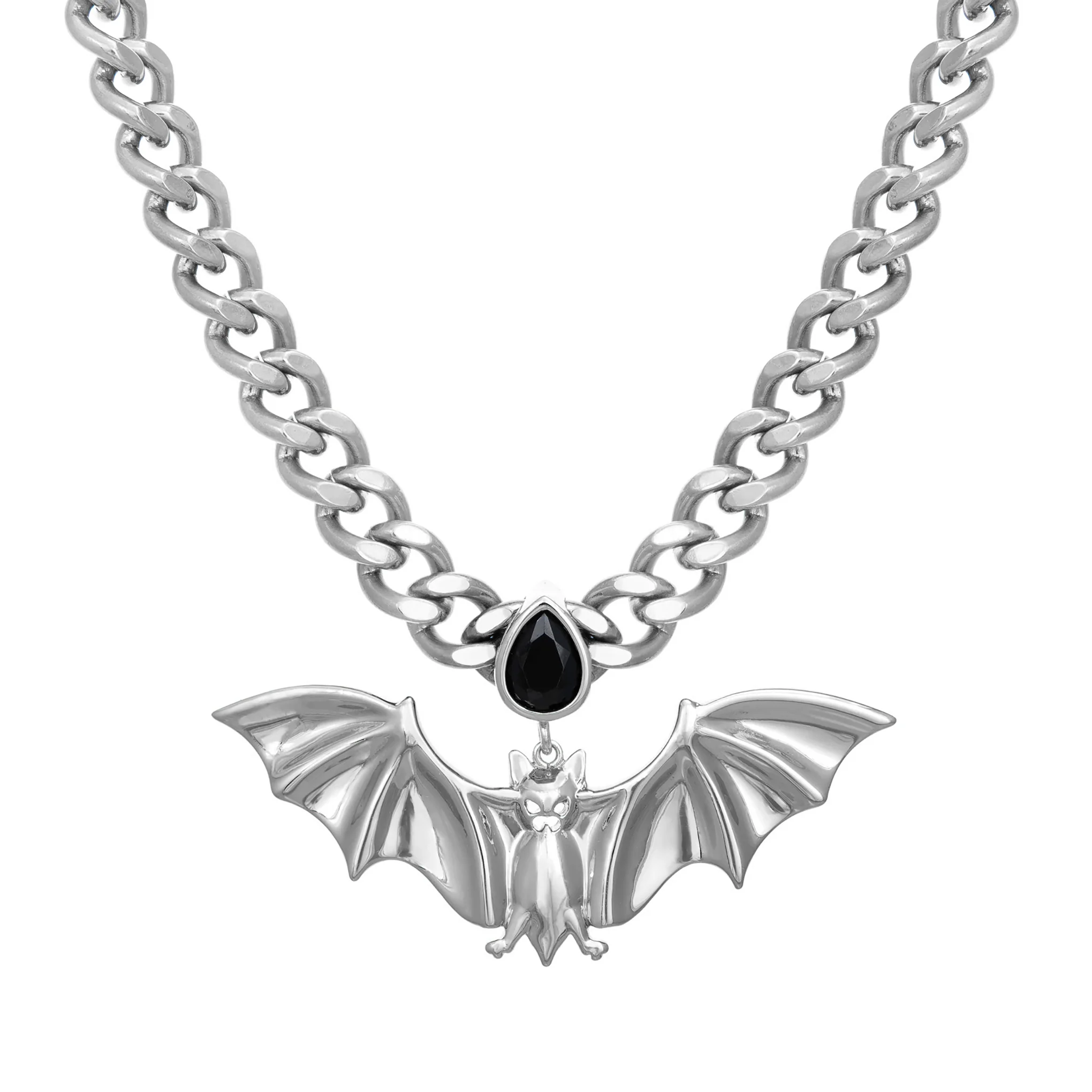The earliest accounts of vampires date back to ancient Sumerian and Babylonian myths from around 4000 BC. From there, the stories spread around the world. Early Slavic societies believed that a bat flying over an unburied corpse could reanimate the recently deceased into a vampire. This is often cited as the original bat-vampire link. Show off your spooky side year round in this substantial choker necklace.