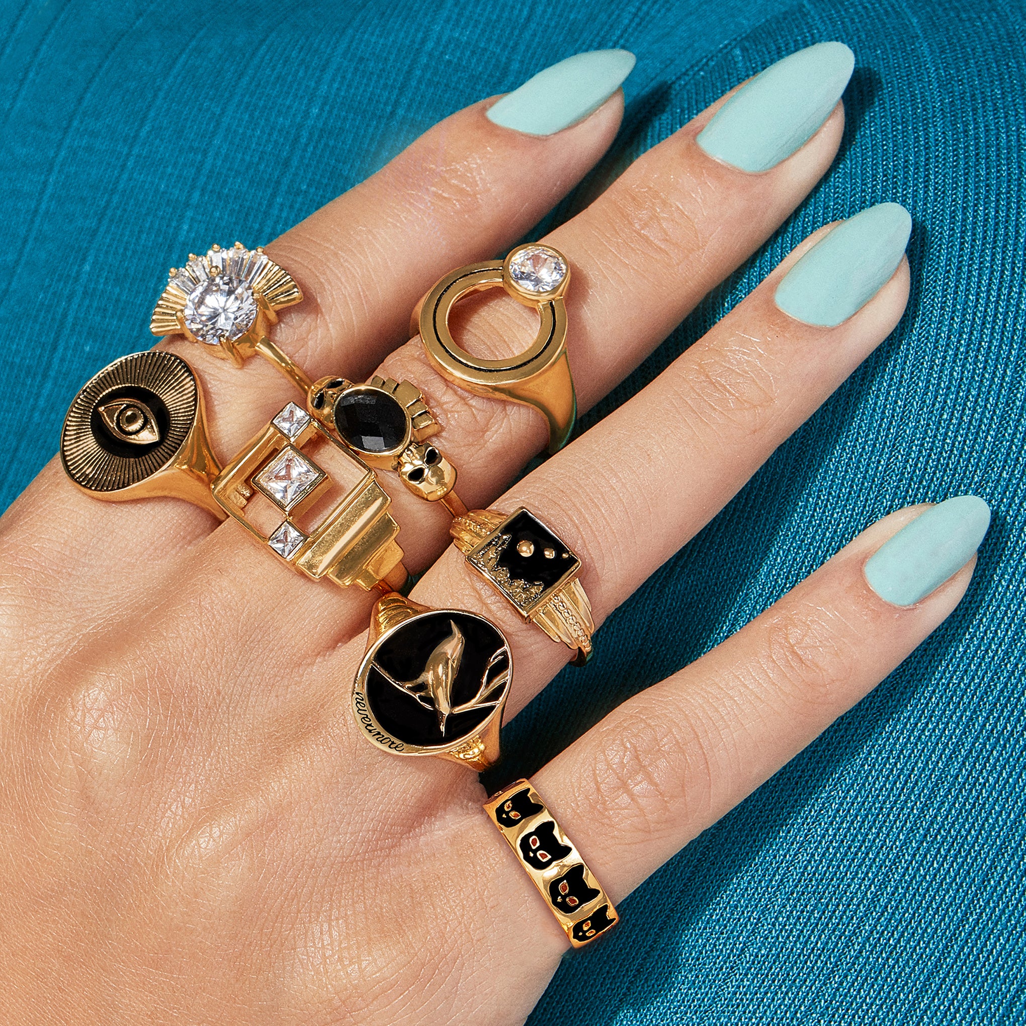The folklore surrounding black cats varies from culture to culture. In Britain and Japan, they are considered good luck. Scottish lore holds that a black cat’s arrival to a home signifies prosperity. Pirates of the 18th century believed that a black cat walking away from someone brought good luck. Fishermen’s wives would keep black cats at home in hopes that they would protect their husband at sea. It was not until the Middle Ages that negative black cat superstitions took hold, with sinister and occult qualities assigned to them. These beliefs were later brought over to America where black cats were seen as demons or a companion to witches. We think they are beautiful, regal creatures who deserve to be celebrated so we put a whole gang of them on this stackable ring.