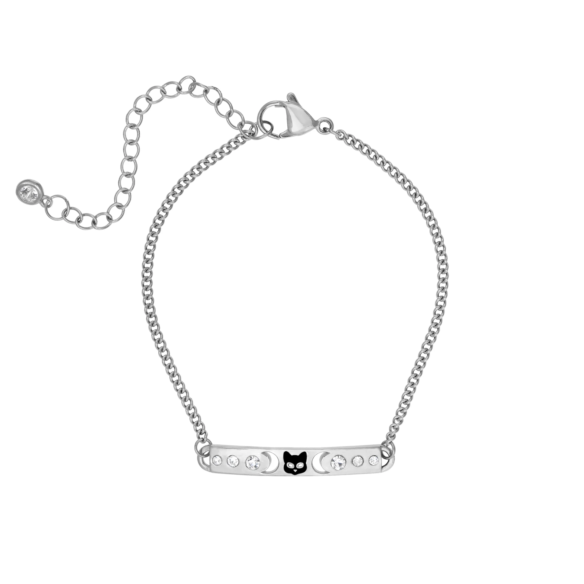 The folklore surrounding black cats varies from culture to culture. In Britain and Japan, they are considered good luck. Scottish lore holds that a black cat’s arrival to a home signifies prosperity. Pirates of the 18th century believed that a black cat walking away from someone brought good luck. Fishermen’s wives would keep black cats at home in hopes that they would protect their husband at sea. It was not until the Middle Ages that negative black cat superstitions took hold, with sinister and occult qualities assigned to them. These beliefs were later brought over to America where black cats were seen as demons or a companion to witches. We think they are beautiful, regal creatures who deserve to be celebrated so we put one on this sweet ID chain bracelet.
