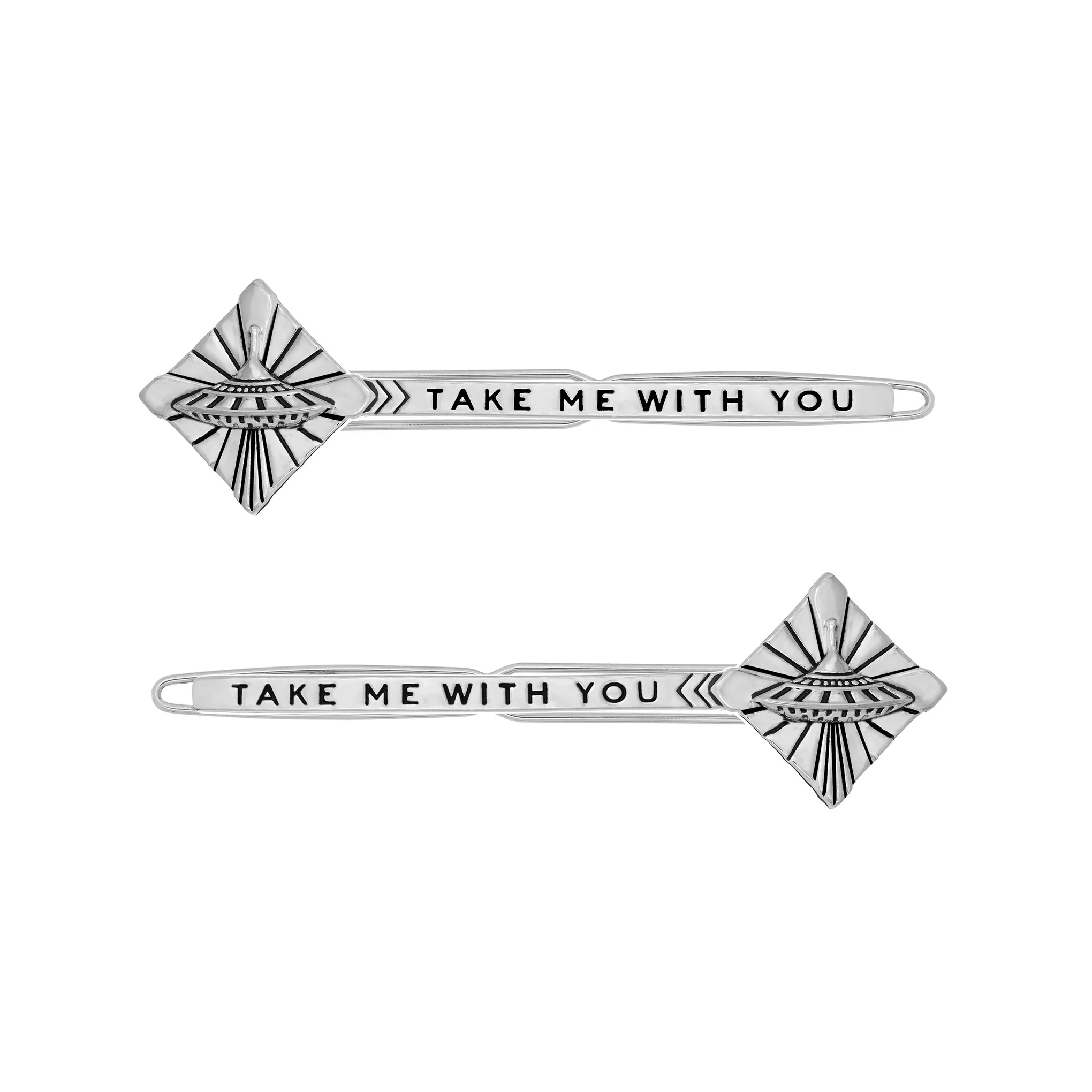 UFO sightings have been reported throughout recorded history in various parts of the world, raising questions about life on other planets and whether extraterrestrials have visited Earth. In Ancient Egypt, 1440 BC, the scribes of the pharaoh Thutmose III reported that "fiery disks" were encountered floating over the skies. Similar sightings were documented in Ancient Greece and Rome. Data compiled by the National UFO Reporting Center and Mutual UFO Network show that between 2001-2015, there have been over 120,000 UFO sightings reported in the U.S. In those 14 years, California had the highest number of reports with almost 16,000 sightings. Wear your love for the unexplained with this retro style hair clip set that read "Take me with you".